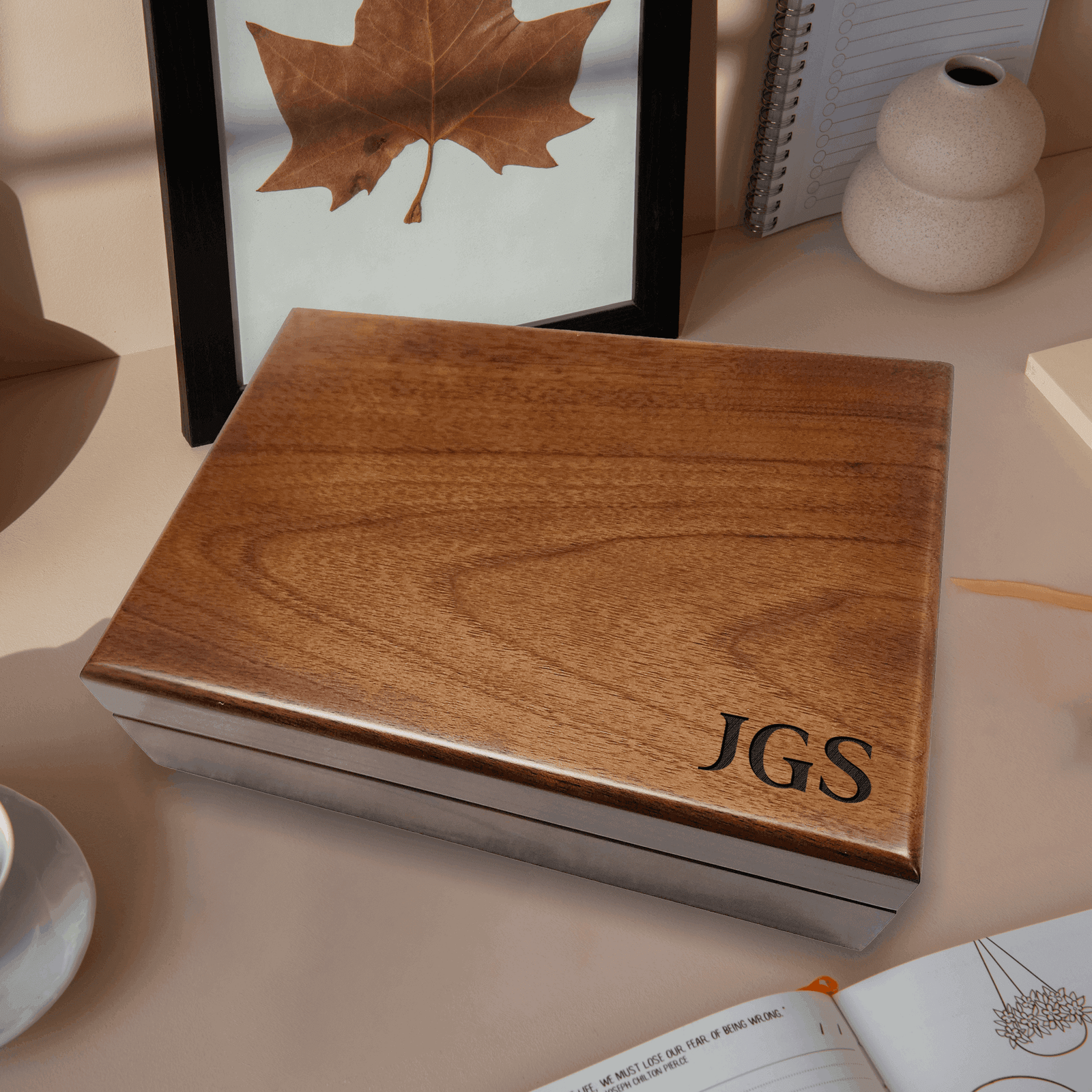 Discover the perfect blend of elegance and functionality with our Large Memory Box, designed to be a memorable gift for him. Crafted from premium walnut, this monogrammed jewelry box not only offers ample storage for cherished items but also adds a personal touch with customizable initials. It’s sophisticated design makes it an ideal keepsake for special occasions, ensuring that your thoughtful gift will be treasured for years to come. It is an ideal gift choice for individuals, couples, and special ceremonies such as engagements, weddings, and baby showers.