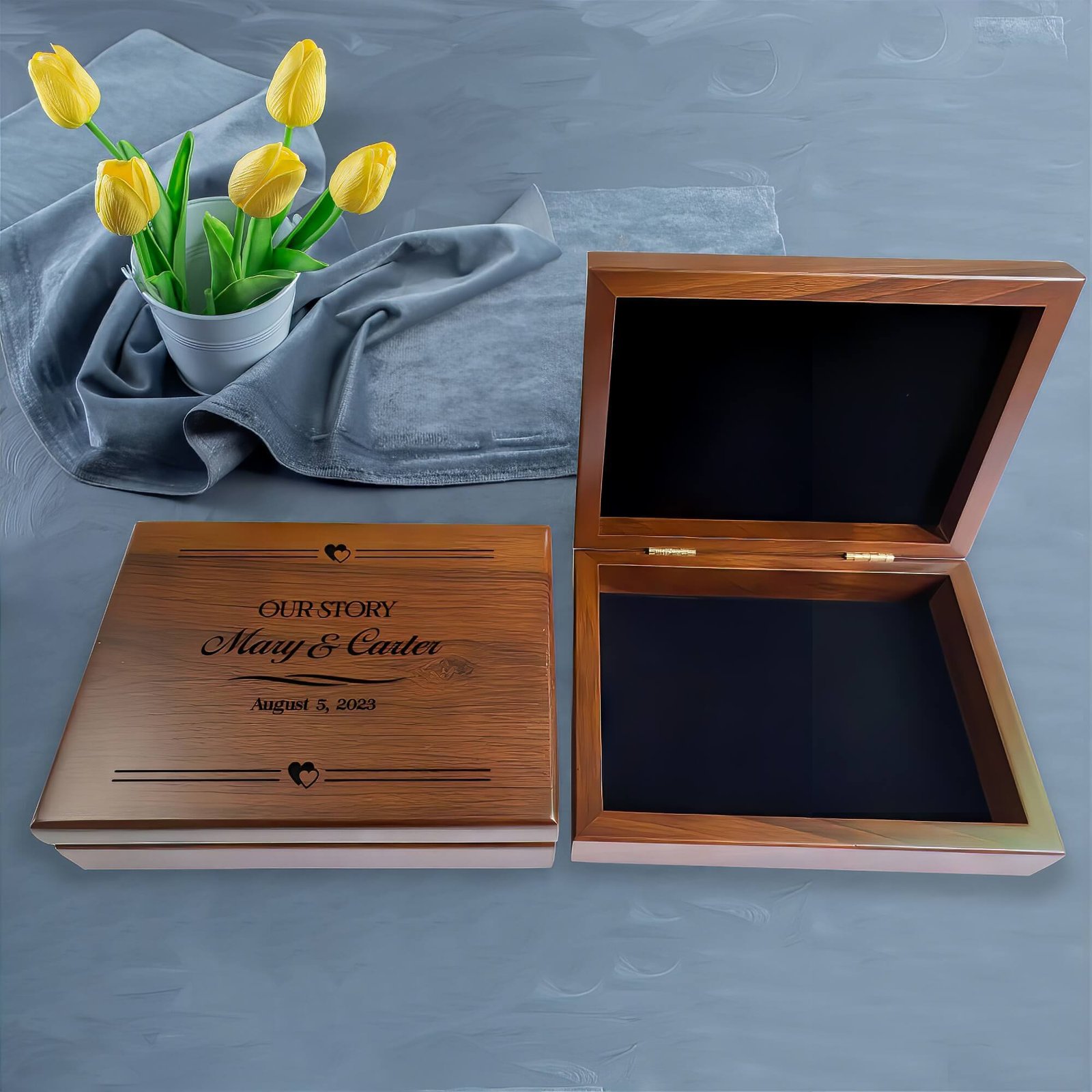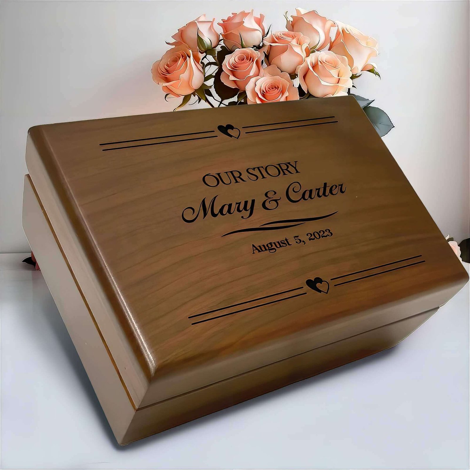 This Personalized Gift for Couples is more than just a box; it’s a future heirloom. Ideal for keeping precious mementos, this beautiful box serves as a wonderful Wedding Memory Box designed to preserve their most cherished moments. The rich walnut wood radiates warmth and elegance, making it a perfect fit for any home decor. This Anniversary Memory Box represents love and commitment, whether given as a wedding gift or for a special occasion. Each time the couple opens this box, they are reminded of the love and memories they share, creating a timeless piece that uniquely and personally celebrates their bond.