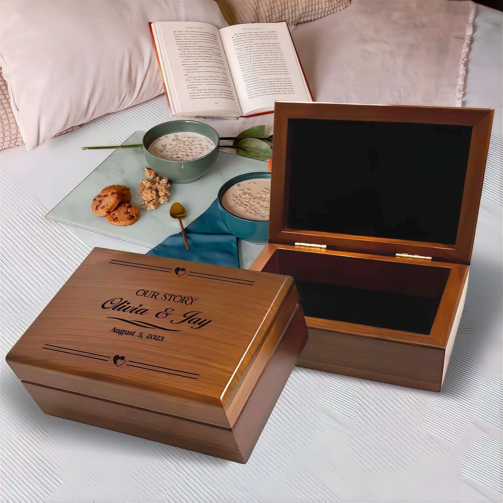 Any couple who wants to cherish and preserve their memories together can use a Wedding Memory Box. Couples who have recently tied the knot can use the memory box to collect mementos from their wedding day, such as invitation cards, dried flowers, or a copy of their vows; as couples celebrate each milestone anniversary, they can use the memory box to gather tokens of their shared experiences over the years. This may include photographs, love letters, ticket stubs from special events, or other sentimental items.