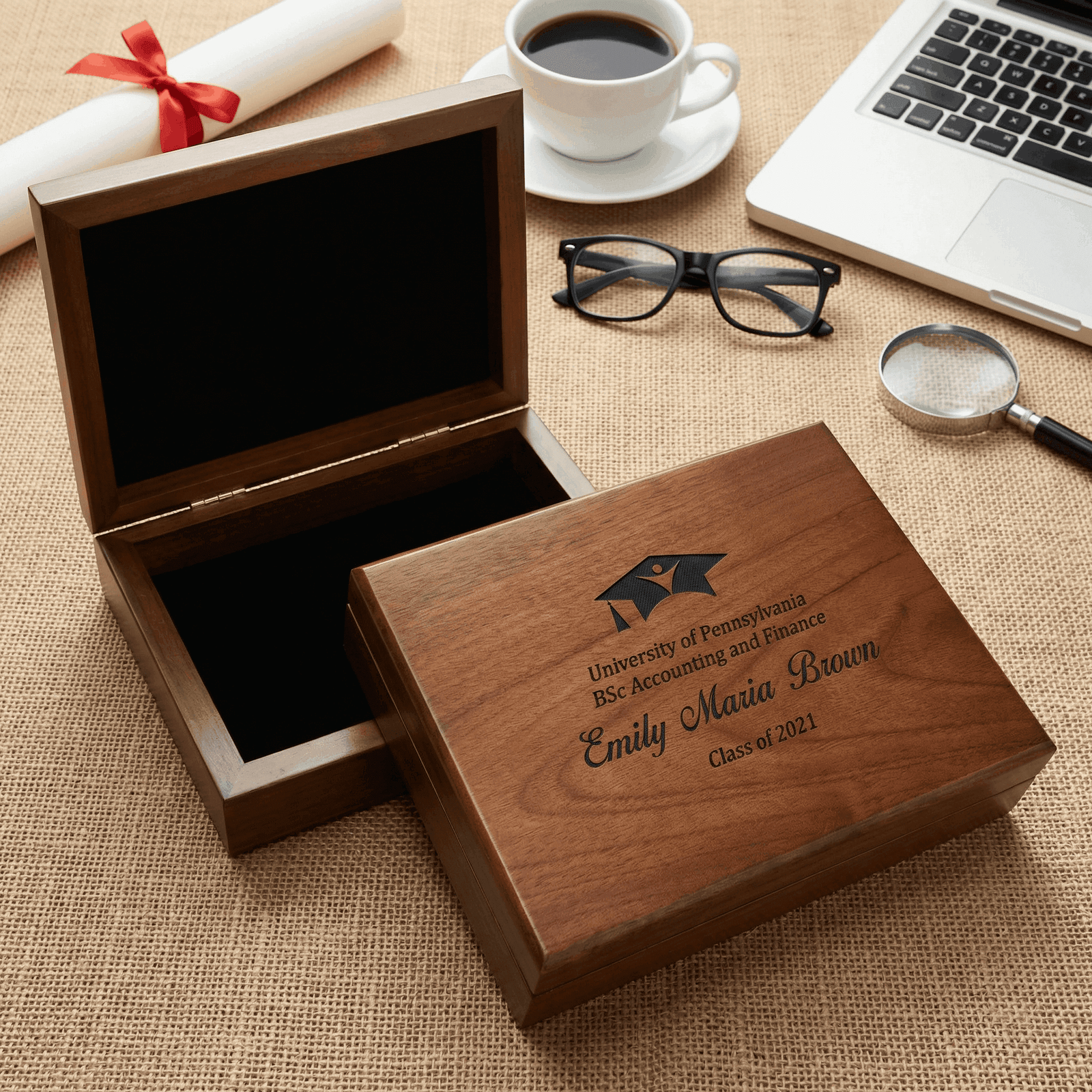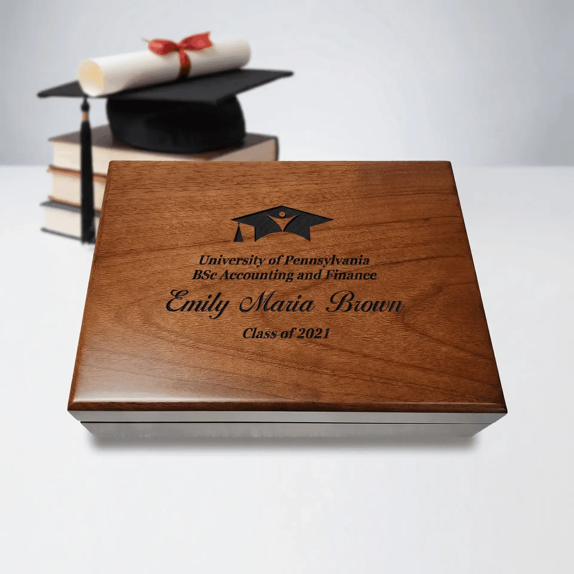 The Personalized Graduation Gifts is a stunning Graduation Keepsake Box, ideal for preserving cherished memories. This thoughtful present exudes elegance and sentiment, making it a wonderful choice for graduation. The engraving adds a personal touch, turning this box into a treasured keepsake. Crafted to hold items such as photos, cards, and small mementos, this graduation card box symbolizes the importance of a significant life milestone. Delight the graduate in your life with this beautifully made Walnut Box. It’s a timeless and heartfelt gift to honor their transition from student to graduate.
