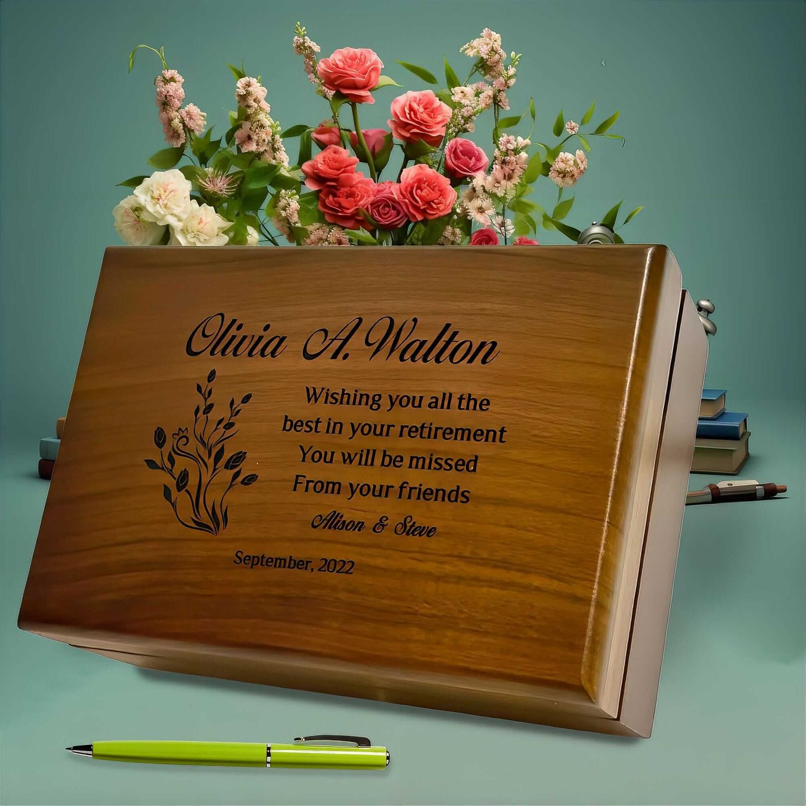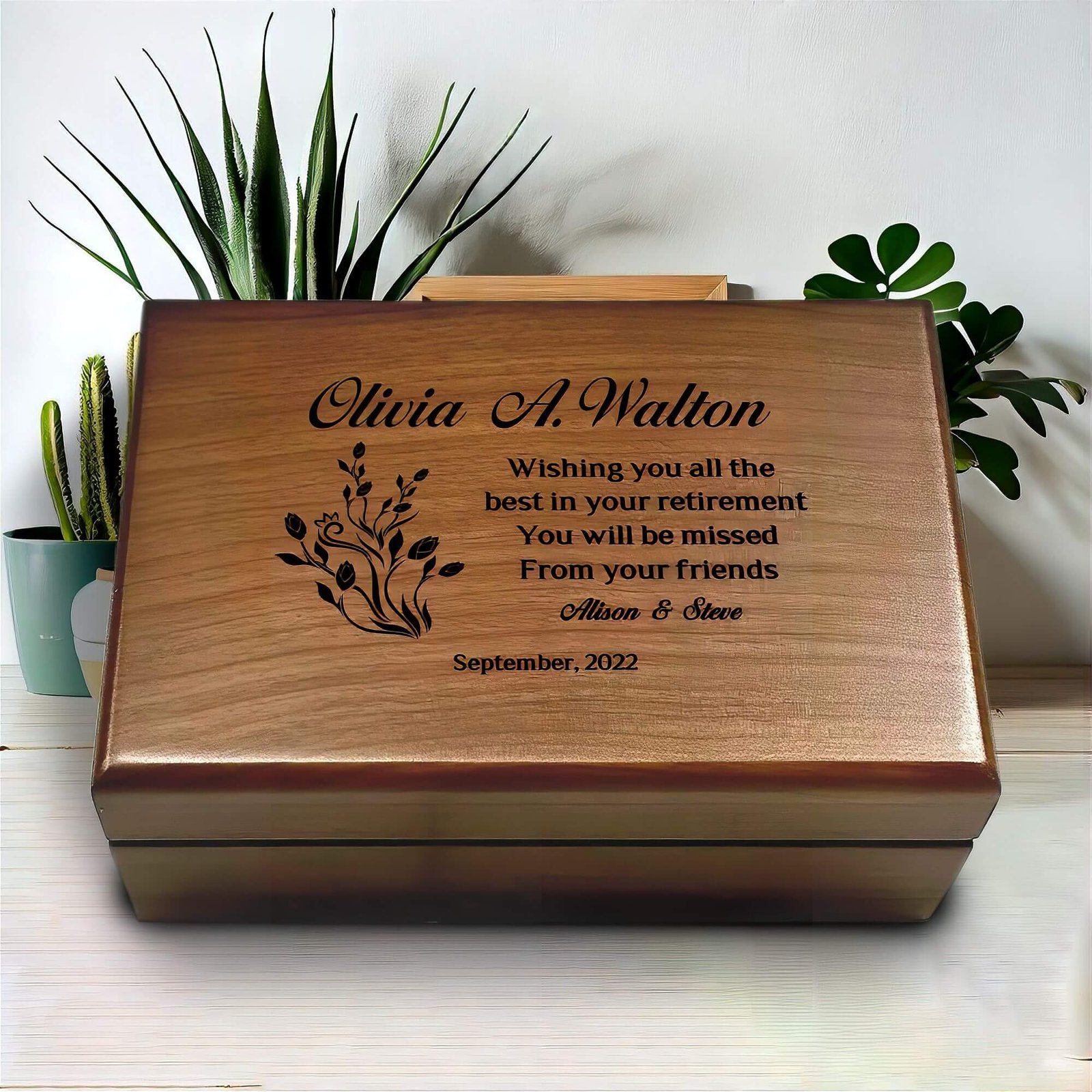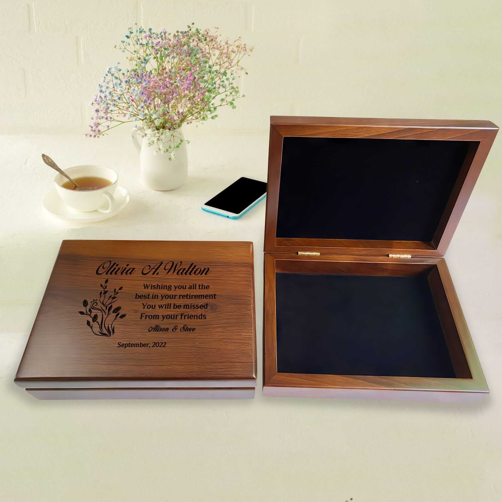 Our Retirement Memory Box is a priceless heirloom designed to perfectly preserve the essence of your most precious memories. The exquisite boxes are made of genuine walnut wood and exhibit a natural beauty that beautifully enhances the importance of the event. A monogram, name, statement, or important date can be added to this chic box.