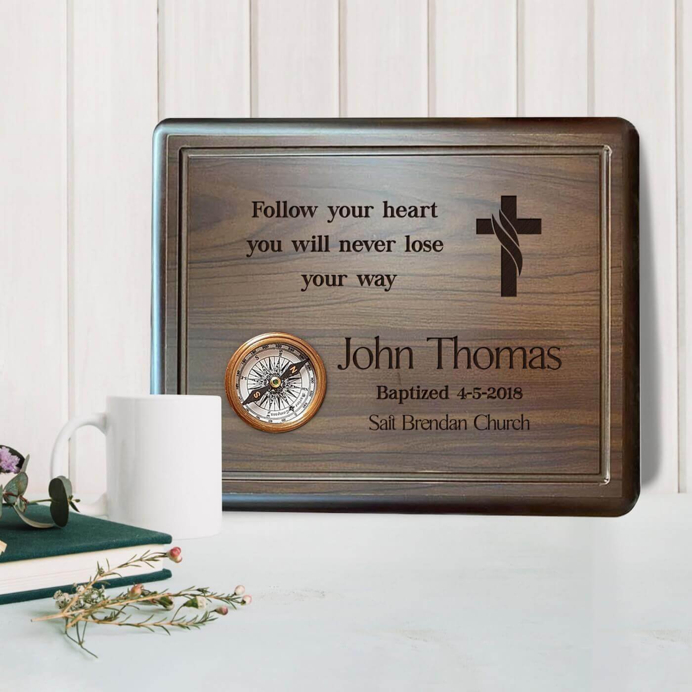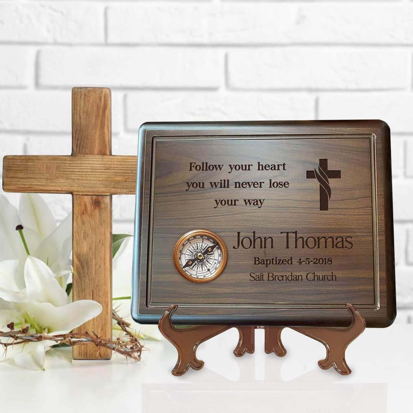 Our baptism gift for boys is a custom-engraved solid walnut wood plaque with an antique brass pocket compass measuring 2.2×0.75 inches, featuring Robert Frost’s poem. This remarkable keepsake captures the spirit of the occasion and makes for a fitting tribute to the newly baptized boy, creating a cherished memento for years to come.